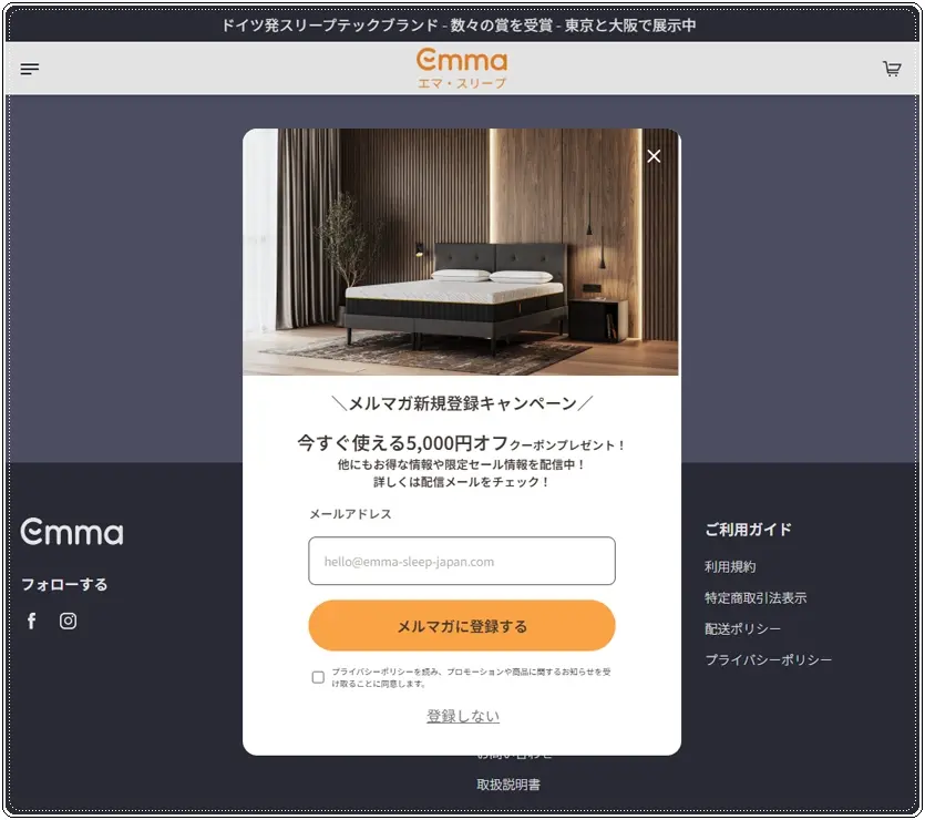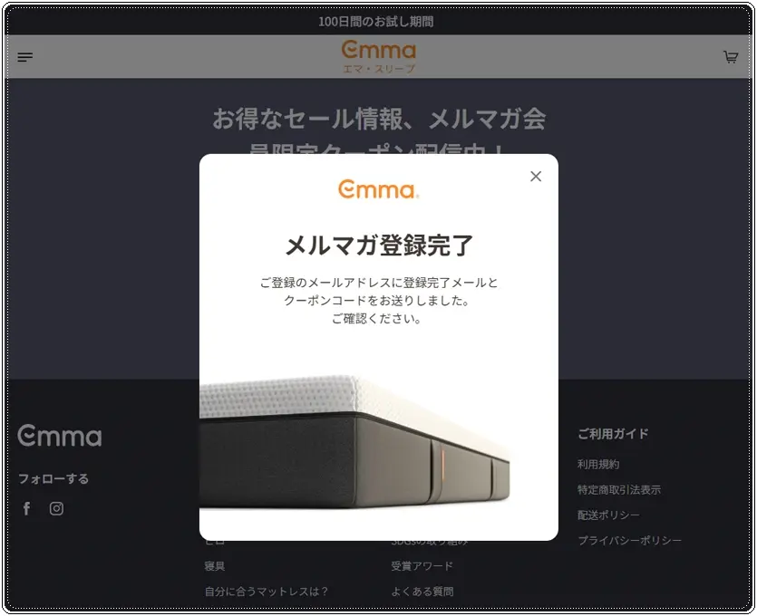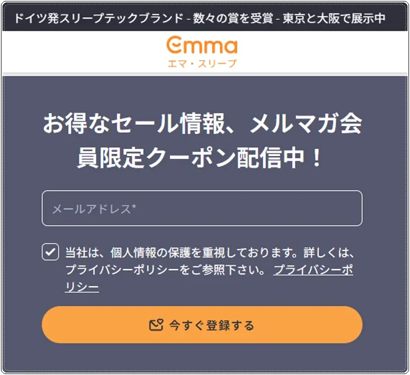 【1】エマスリープ公式サイトを初めて訪問された場合は、1000円オフのクーポン付きメルマガ登録ポップアップウィンドウが表示されます。(2026年4月現在)